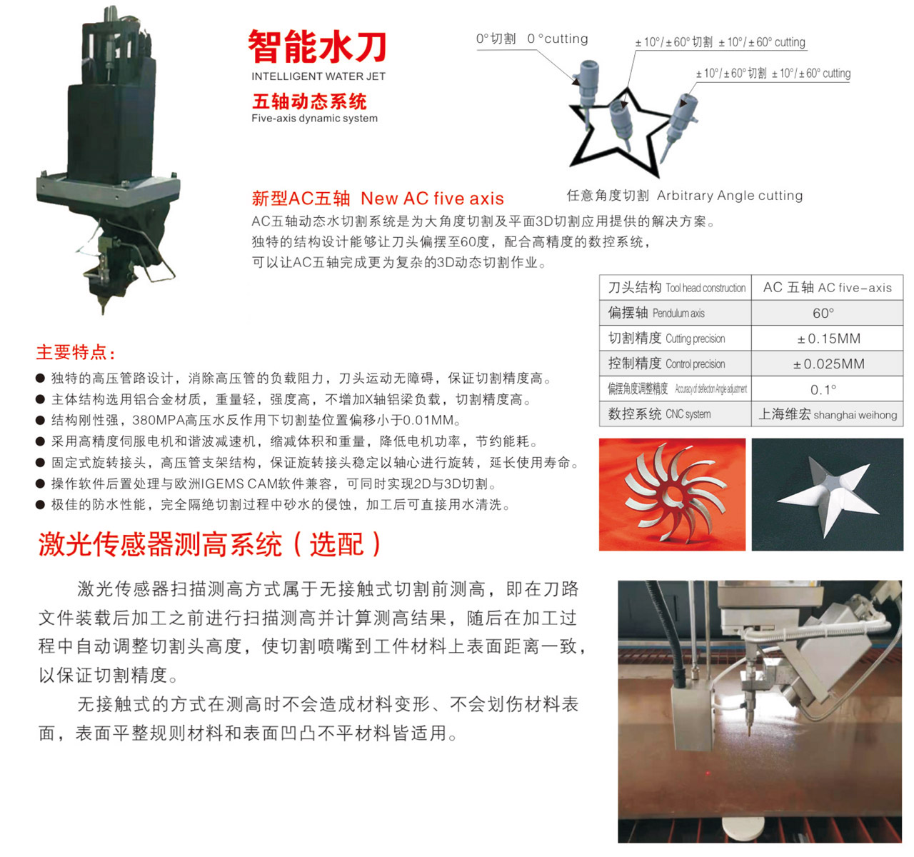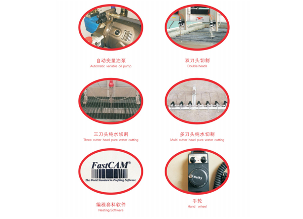 用戶選配 1、翻轉(zhuǎn)臺面 2、油冷機阿 3、風(fēng)冷機 4、軟化水系統(tǒng) 5、精密砂量控制漏砂器 6、無線遙控 7、自動變量油泵 8、雙刀頭切割 9、多刀頭純水切割 10、自動清砂系統(tǒng) 11、手輪